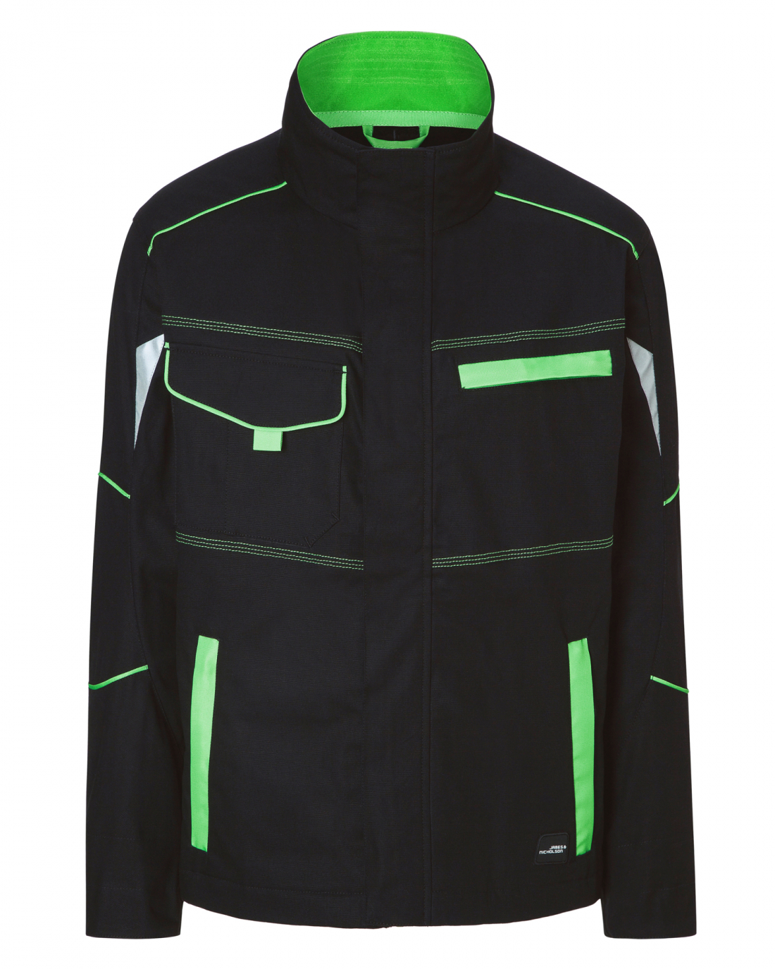 Professzionális munkakabát divatos színösszeállításban Könnyű, elasztikus vászon Tökéletes, kényelmes viselet az elasztánnak és az ergonomikus kialakításnak köszönhetően Állógallér belül finom polár borítással Ergonomikus szabású ujjak Teljes hosszában fedett cipzár szélfogó betéttel és állvédő végződéssel Rugalmas belső kézelő Cipzáras oldalzsebek, mellzseb és belső zseb Mellzseb hajtókával és tépőzárral, belső mobiltelefon zseb Fényvisszaverő díszítés a karon és hátul 60°C-on mosható, szárítógépben szárítható Valamennyi gomb és cipzár fedett Alapanyag (250 g/m²): 97% pamut, 3% elasztán Rendelhető méretek: XS-6XL