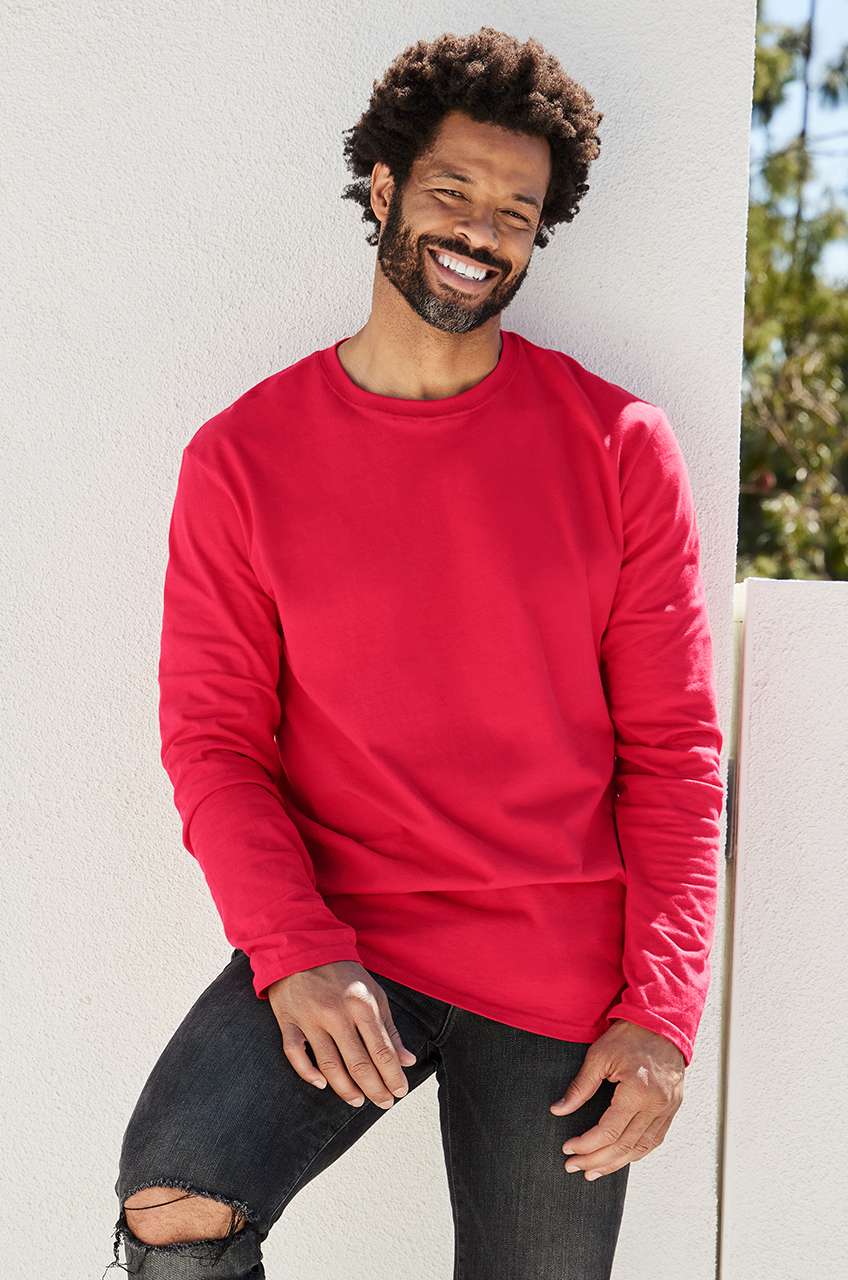 153.0 g/m2 (White 144.0 g/m2);100% gyűrűs fonású pamut;Pamut/poliészter keverék egyes színek esetében;Eurofit - keskenyebb szabású váll és ujjak;Simább nyomási felület a magas öltéssűrűségnek köszönhetően;Varrás nélküli. duplán tűzött 1.9 cm széles nyakkivágás;Válltól-vállig pántos;Kitéphető címke;Előrehajtott vállrész;Dupla tűzésű karkivágás és derékrész;Gyűrődésmentesítő behajtás;Nyakvarrás változik duplatűzésűről rejtett tűzésűre;Készleteink vegyesek;