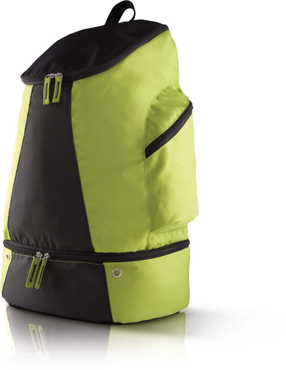 Sporthátizsák 600D poliészterből és Ripstop 300D anyagból;Nagy fő rekesz és alul cipőtartó rekesz szellőző lyukakkal;Oldalzsebek. párnázott lélegző hátrész és állítható vállpántok;
