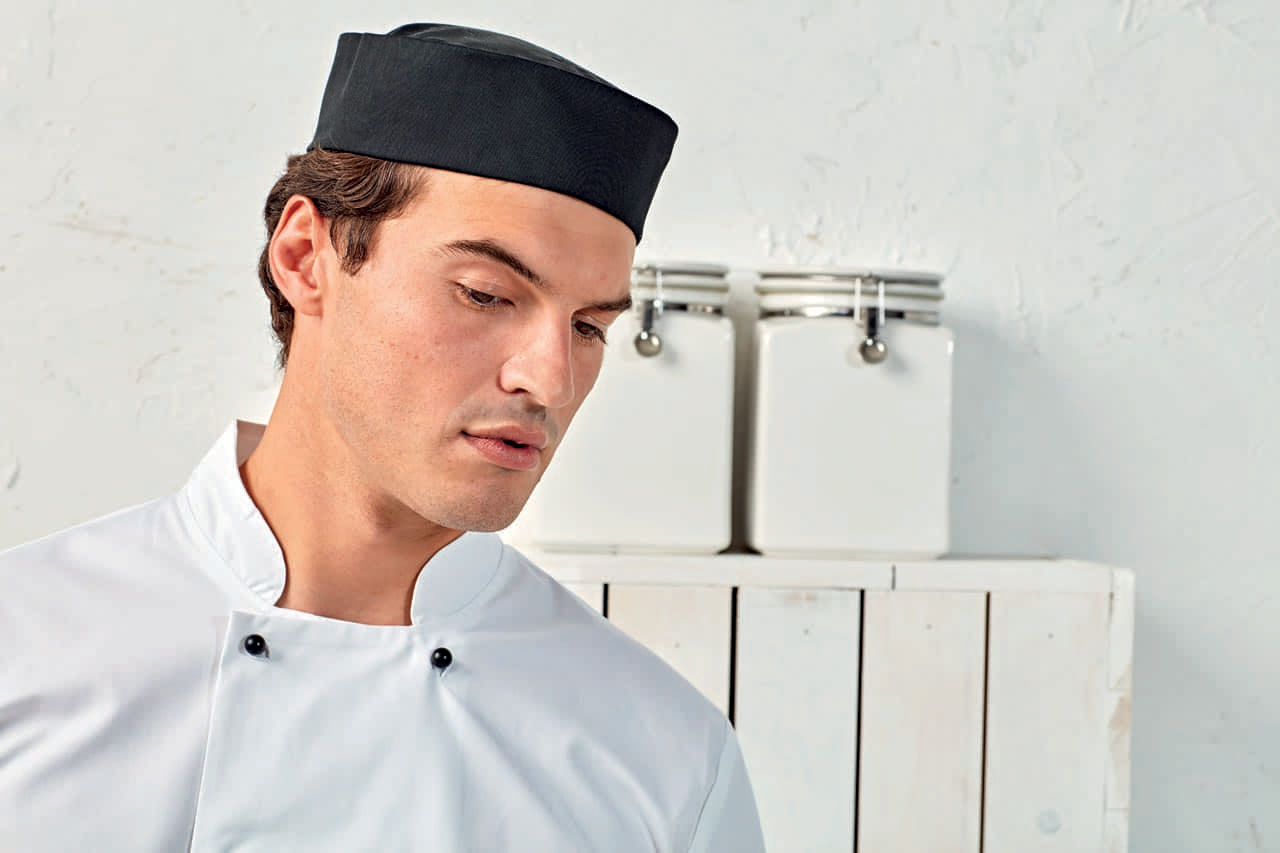 Szövet;65% poliészter. 35% pamut twill;195 g/m2;Tulajdonságok;Kifordítható dupla szegőpánt;A tetején öt lyuk a szellőzés érdekében;Könnyen vasalható;