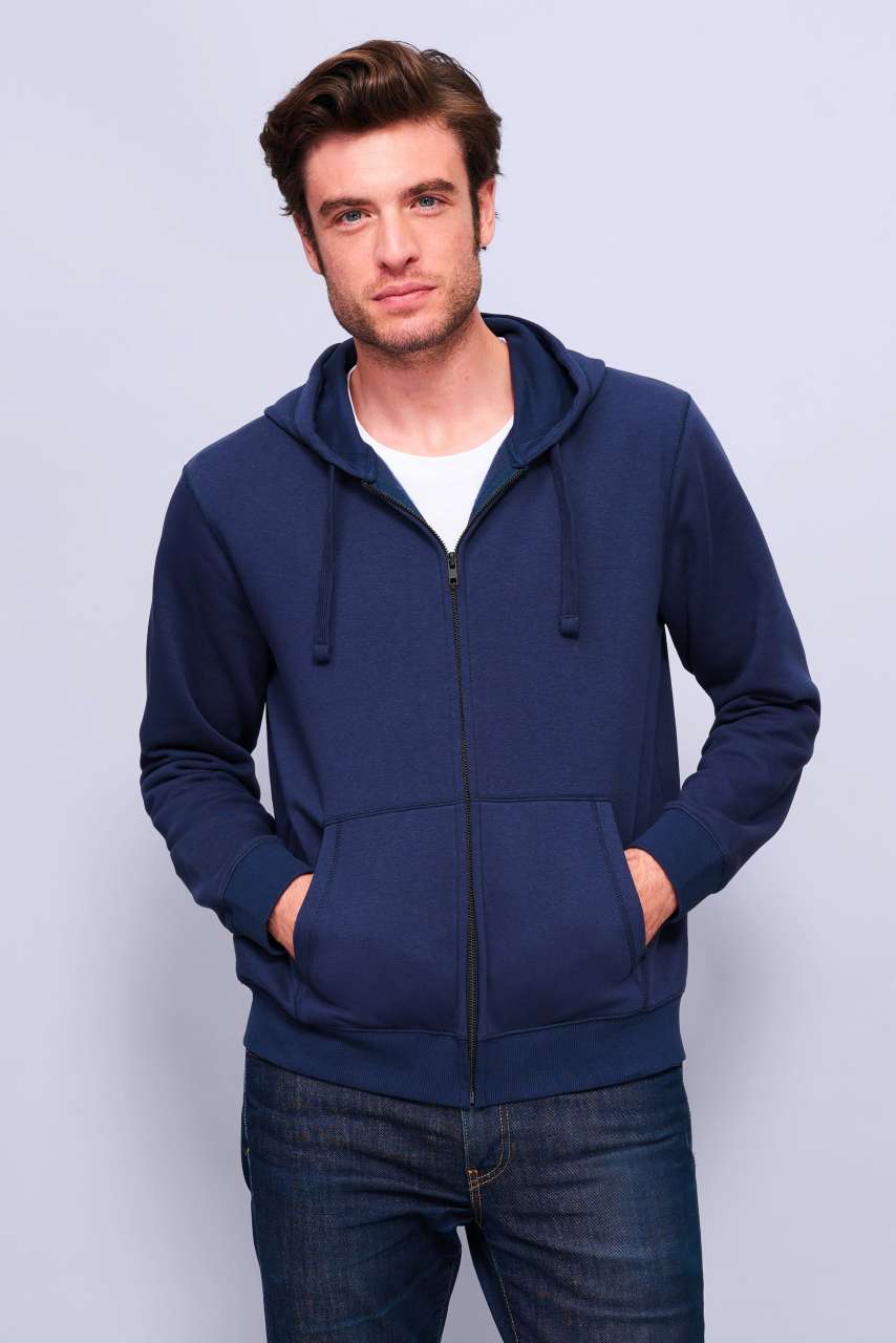 Minőség;80% gyűrűs fonású pamut - 20% poliészter;Csiszolt bélés;Külső: 100% pamut;Stílus;Bevarrt ujj;2 elülső foltzseb;Oldalvarrott;Bélelt kapucni színazonos húzózsinórral;2x2 bordázott mandzsetta és szegély;Félhold alakú belső gallér;Pántos nyak;YKK cipzár;
