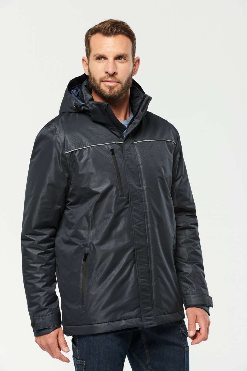 100% poliészter;Külső: 100% poliészter ripstop;2 rétegű. ragasztott. 3000 g/m²/24 órás lélegző és 10000 mm-ig vízálló szövet;Megfelel az EN343:2019. 3. osztály szabványnak (a ruhadarab megvéd az esőtől);Bélés: 100% poliészter;100% poliészter belső párnázás;Elöl: 2 oldalzseb és 1 mellzseb vízálló műanyag cipzárral;1 belső zseb tépőzárral;Cipzárral és tépőzáras szélfogóval;A mellkason kontrasztos paszpollal;Bélelt és párnázott. 3 részből szabott levehető kapucni állítható cipzárral. stopperrel és tépőzárral;Állítható mandzsetta tépőzárral;2 részből szabott bélés: a felső rész polár. az alsó rész párnázott;A szegély stopperrel állítható;Láthatatlan belső cipzár a díszítéshez: 1 bal oldalon. 1 a szegélyen;A nyak belső oldalán akasztóval;Kitéphető márkacímke;