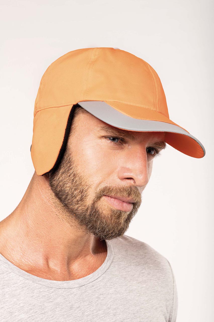 EX KP122;100% poliészter;6 panel fültakaróval;Neonszínű sapka polárbéléssel;Állítható húzózsinór és stopperek;