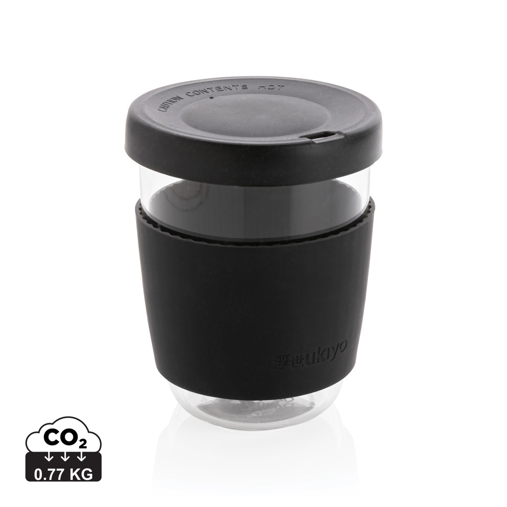 Ukiyo boroszilikát üvegpohár szilikon fedéllel és tokkal. Karcsú kialakítású pohár ízléses markolattal. A fedél kis szellőzőnyílása lehetővé teszi a gőz távozását, ezáltal megakadályozza a nyomás kialakulását. BPA-mentes. Űrtartalma: 360 ml.