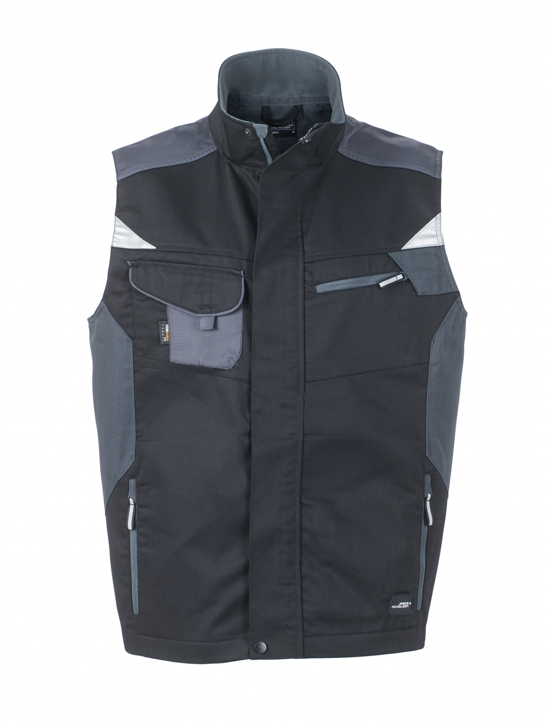 Professzionális munkamellény Erős, strapabíró kevertszálas anyag Állógallér belül puha polár anyaggal CORDURA® erősítésű vállrész Teljes hosszában fedett cipzár viharhajtókával Tágas szellőzőnyílásokkal a hátoldalon Oldal-, mell- és cipzáras belső zseb Mellzseb hajtókával, belsől mobiltelefon zsebbel Fényvisszaverő betétek elől és hátul 65% poliészter/35% pamut, 250 g/m² Rendelhető méretek: S-3XL