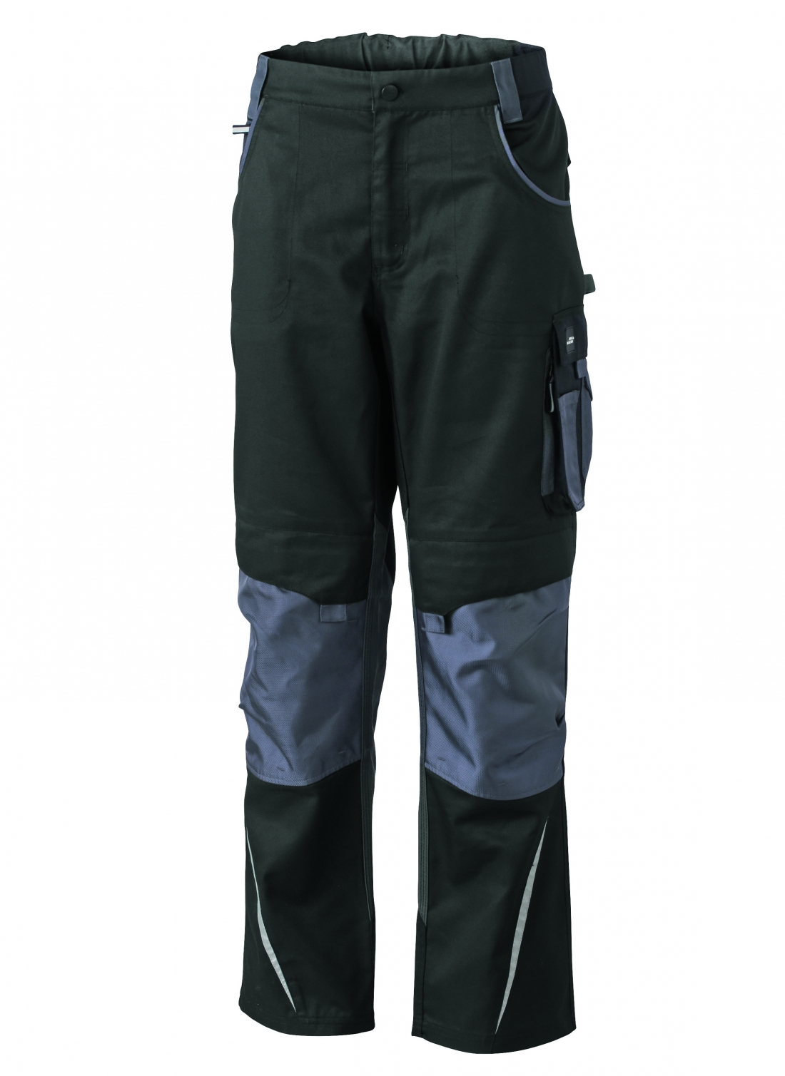 Professzionális munkanadrág funkcionális részletekkel Strapabíró, kevertszálas anyag Elasztikus, állítható derék övpánttal CORDURA® erősítésű térdpárnatartó zsebek Zsebek, számos szerszámzseb 2 oldalzseb cipzárral, Vonalzó-, toll- és telefonzseb Fényvisszaverő díszítés a hátrészen 65% poliészter/35% pamut, 260 g/m² Rendelhető méretek: Rövidített: 25-28 Standard: 46-68 Hosszított: 94-110